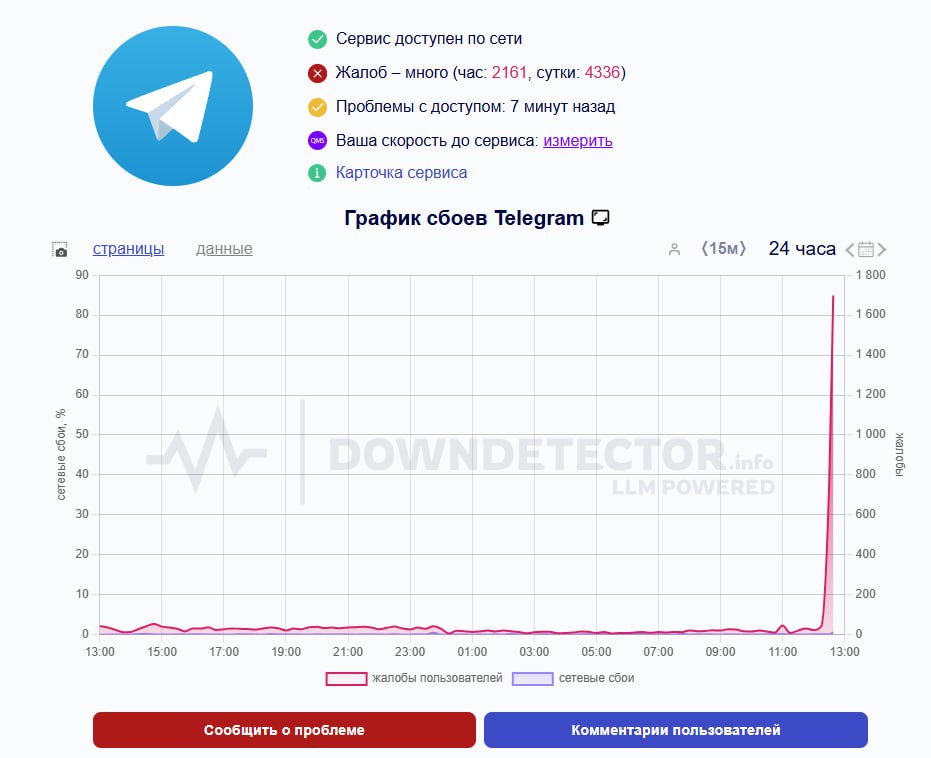 Пользователи популярного мессенджера Telegram на территории России столкнулись с масштабными техническими неполадками. Согласно данным аналитического сервиса Downdetector, отслеживающего работу онлайн-сервисов, за последний час количество сообщений о проблемах превысило 3,4 тысячи.