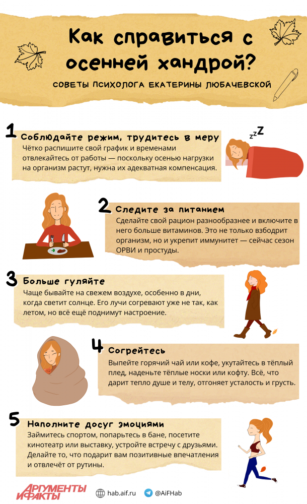 Следует отметить, что ранее психотерапевт Антон Волков также давал рекомендации по борьбе с осенней депрессией. Он подчеркивает, что если все попытки самостоятельно справиться с осенней хандрой не приносят желаемого результата, не стоит откладывать визит к специалисту за квалифицированной помощью.