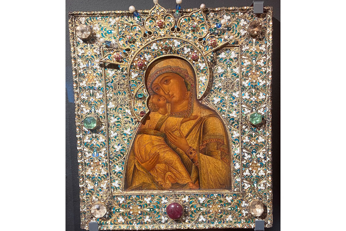 Каждый из шести экспонатов наглядно иллюстрирует этапы развития искусства эмали в XVII веке. Например, икона «Богоматерь Владимирская», созданная в Оружейной палате Московского Кремля, демонстрирует тончайшую технику узорочья. Орнаменты выполнены с использованием серебряных и золотых нитей, скрученных в жгут или представленных в виде лент. Полученные контуры заполнены эмалевым порошком. Результат впечатляет: фон иконы выглядит как цветущий сад, сияющий на свету. Эта икона встречает посетителей первой. Многие могут подумать, что она инкрустирована драгоценными камнями, но это эффект прозрачной (транспарантной) эмали, которая пропускает свет и обладает блеском, напоминающим сияние самоцветов.