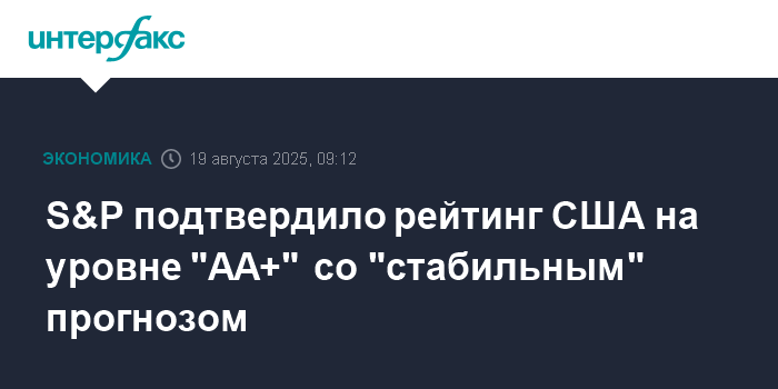Международное рейтинговое агентство Standard & Poor`s Global Ratings (S&P) официально подтвердило долгосрочный суверенный кредитный рейтинг Соединенных Штатов Америки, установив его на уровне «AA+». Это решение было объявлено в рамках официального пресс-релиза организации.